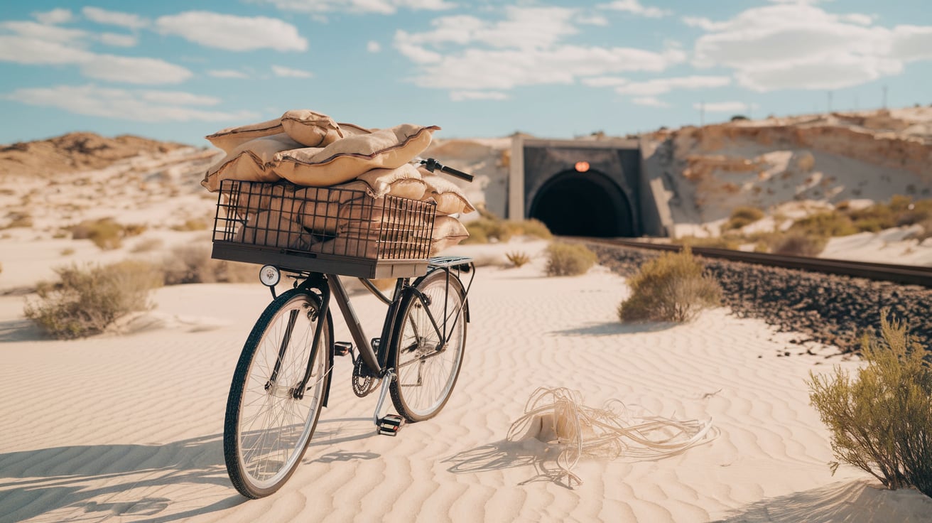 Javier comes up to the Mexican border on his bicycle...-- "After a year of smuggling 'sand' across the border, Javier's secret left the guard guessing—what was he really transporting?"He’s got two large bags over his shoulders.